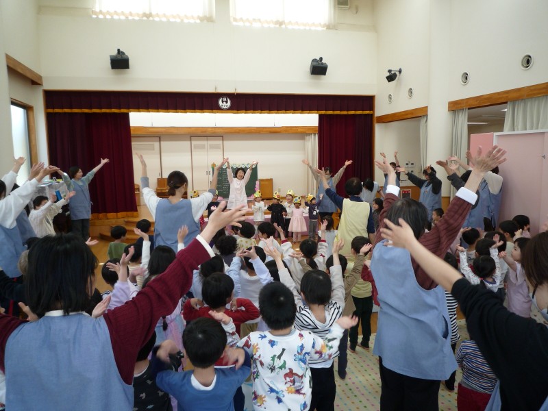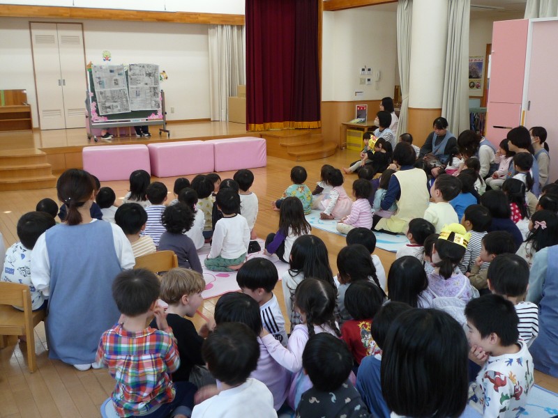 新しい年度になって、初めての集会!「みんな座っていられるかな?」「お話はちゃんと聞けるかな?」と心配していましたが、そんな心配は無用でした。ずっと前から上のクラスだったように、しっかりした様子でお話を聞いたり行儀良く座っていたりできました。