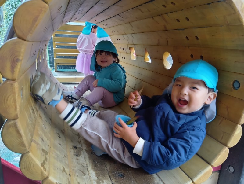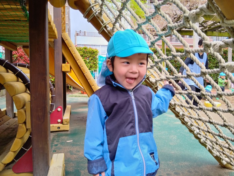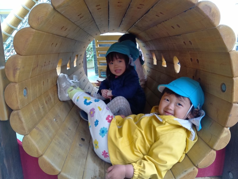 園庭の大型遊具で、かくれんぼごっこが始まりました。保育士が見つける前に、「先生~、ここだよ~!」と顔をのぞかせていたシーンが多く、とてもかわいらしかったです。