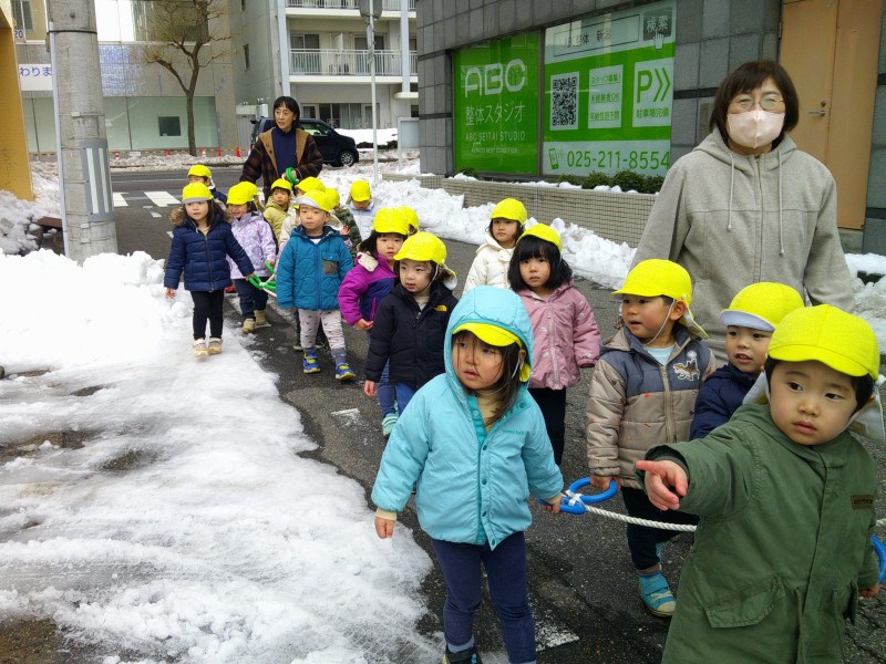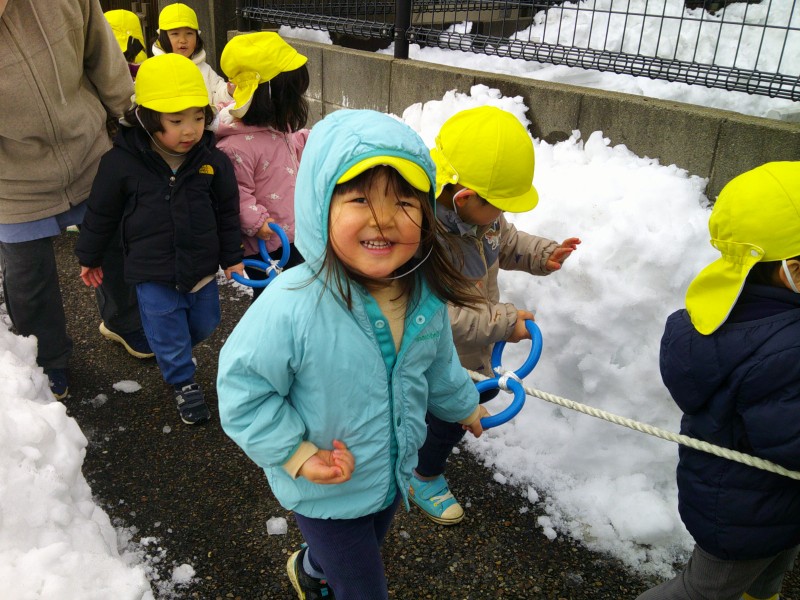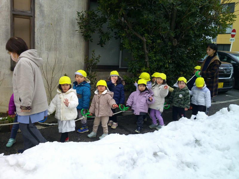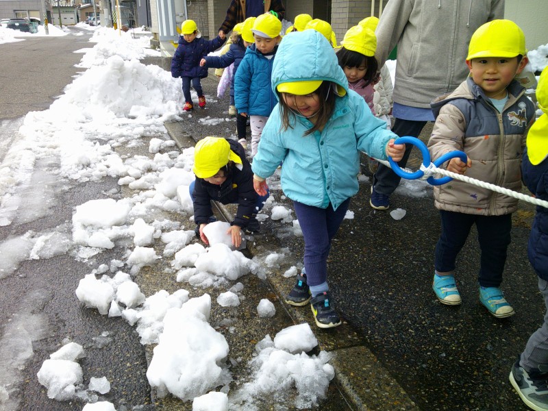 雪がたくさん降って、外で遊べていませんでしたが、この日は天気も良く雪も溶けてきたので、久しぶりにおさんぽへ!ツルツル滑ってもそれが楽しく、みんな大笑いでした。「つめたー!」と手で触って冷たさを体感したり、シャリシャリ踏んで感触を楽しんでいました。