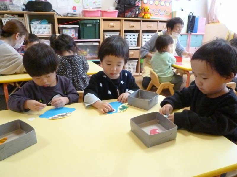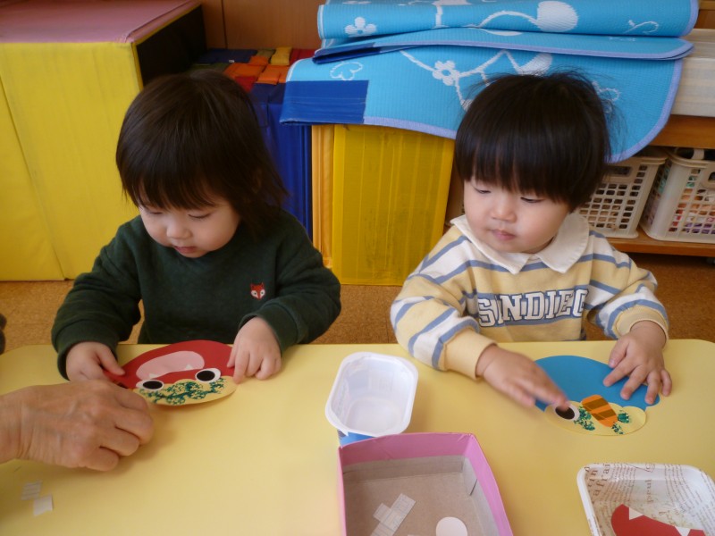 今回はツノ・目・口を貼り、鼻をクレヨンで描きました。どこに貼ろうか迷っている子、ドンと一発で貼る子などいろいろでしたが、「あっ、おにさんだ!」「こわ~い」と会話も弾み、楽しんでいました。