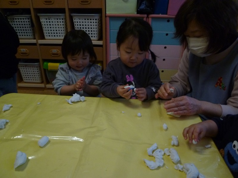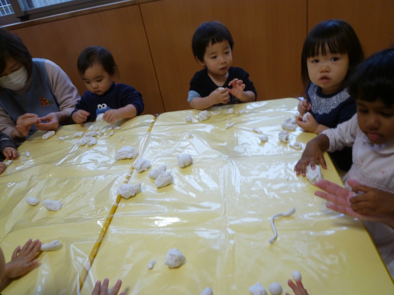 ちぎったり、ニギニギと握ってみたりと感触を確かめた後は、たくさんコネて小さな丸。ぎゅぎゅっと固めて大きな丸、コロコロと伸ばして長いヘビなど、それぞれが思い思いに楽しんでいます。