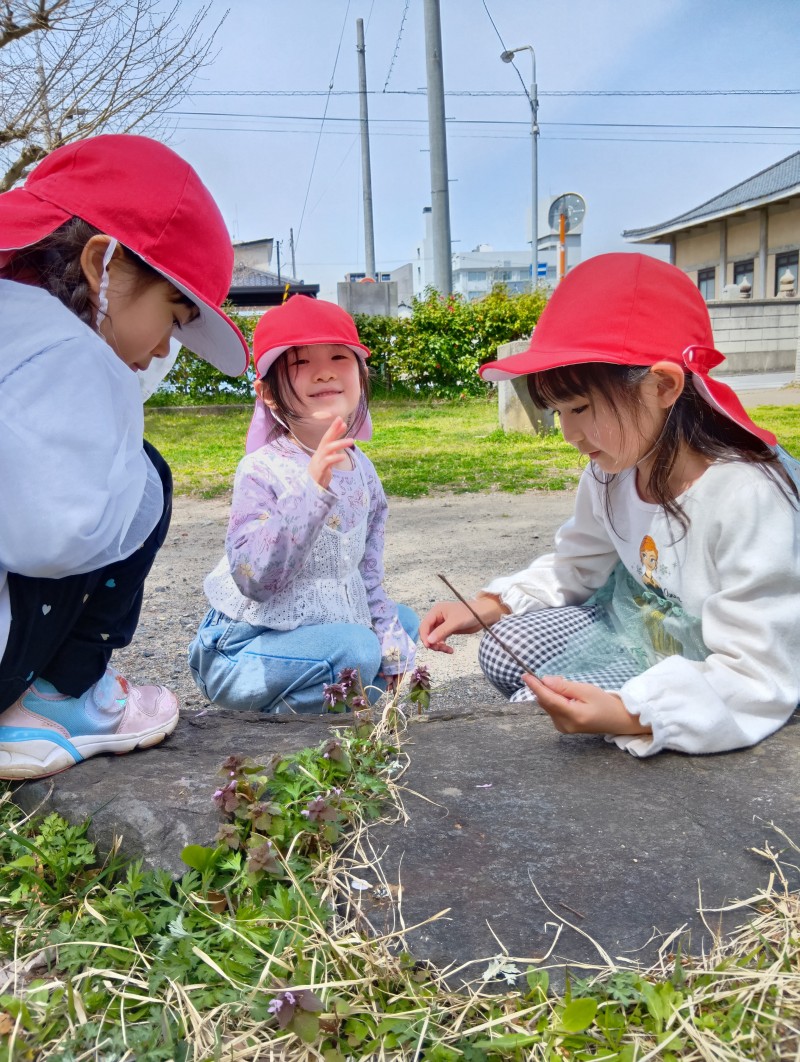 きれいな花を見つけると、「もってかえる!」と袋にたくさんの花を入れて楽しそうでした。最近は、ヒメオドリコソウが人気です。