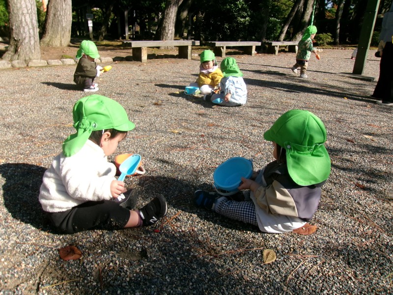 つぼみ組さんの最近のブームは、「スコップとバケツ」「いろとりどりの落ち葉」「バスにのって」です。
