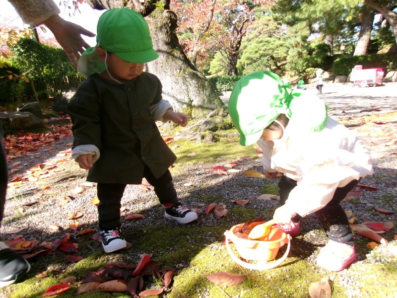 自分の好きな遊びを存分に味わい、そのあとは場所をかえて“どんぐりひろい!”。「いっぱいあるー!!」と大喜びでひろっていました。本当に、たくさんどんぐりが落ちていて、みんなひろい放題!どんぐりのおみやげ、どっさりでした。