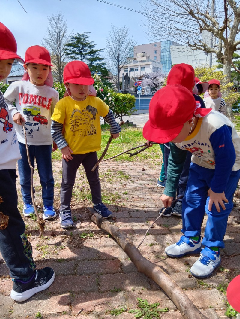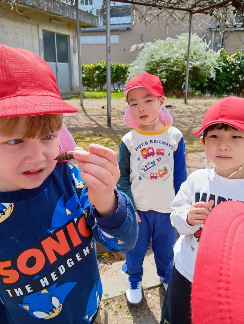 お外もあたたかくなり、虫さんを発見する機会も増えました。この日はみんなでアリさんを探しに、葉っぱの下や砂の中をキョロキョロ・・・。「アリ、つかまえたよー!」とうれしいそうな声が聞こえてきて、バケツやカップの中に入れて、じっくり観察していましたよ!
