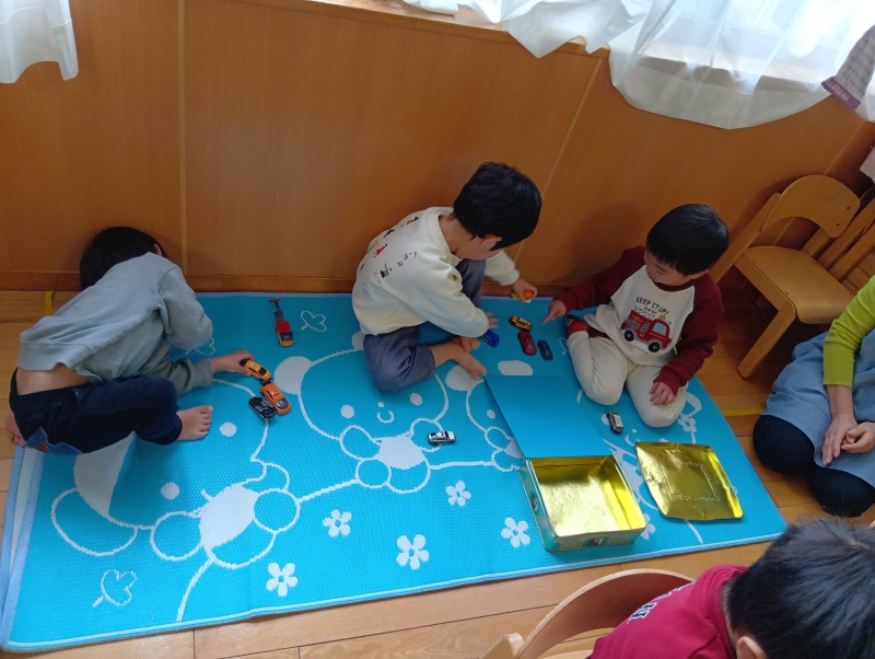 ドキドキワクワクしながら宙組さんのお部屋に行ってみると、なんと‼、“バス”がありました。そのバスにみんなで乗り込み、遠足に出発! 楽しい歌を歌っていると、到着ー! バスから降りてシートに座り、本当の遠足さながらに、特別にみんなでおせんべいを食べました♡ 最後に宙組さんと楽しい思い出ができました!