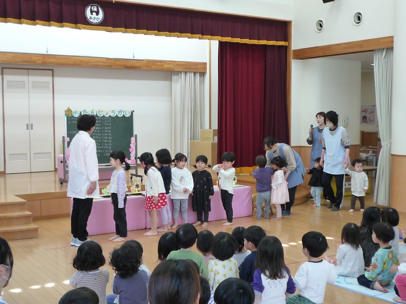 今年度最初のお誕生日会で、みんな上手にできるかなと心配していましたが、そんな心配は無用でした。お誕生日のお友だちはみんな上手にごあいさつできたし、お祝いするお友だちも行儀良くお話を聞いたり、お歌を歌ったりできました。