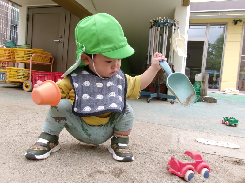 園庭の木陰に座ってスコップやバケツで遊んだり、落ち葉を拾ってみたり、砂の感触を楽しんだりして遊んでいます。