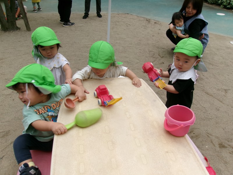 お散歩に行ったり、園庭遊びを楽しんでいるつぼみ組さん。上手にスコップで砂をすくってダンプカーのおもちゃにのせたり、お友だちとテーブルを囲んで秋の心地よい風を感じたりと、外遊びを満喫しています。