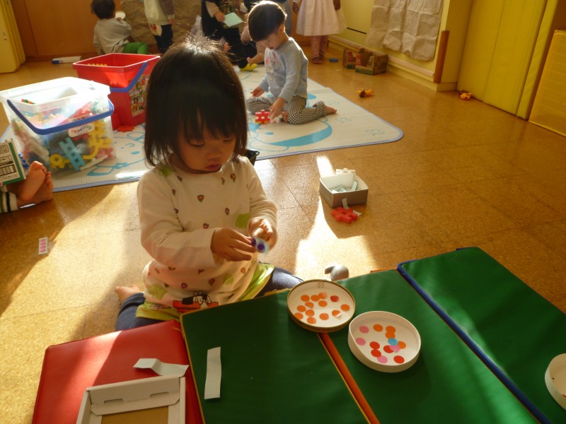 お部屋に型はめパズルや絵合わせパズルを用意すると、「これするー!」「できないー!」「かーしーてー」「できた!」とあちこちから話し声が聞こえ、長い時間集中して遊んでいました!