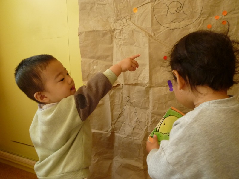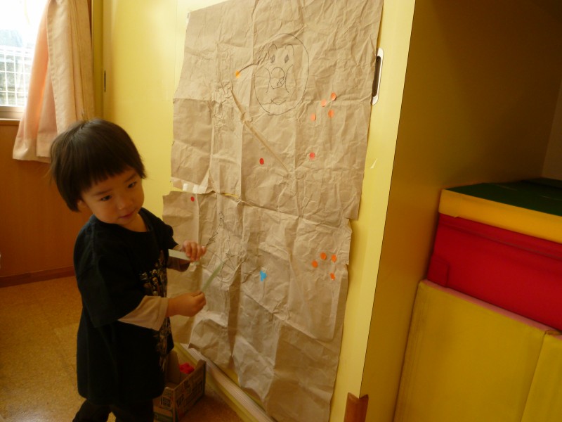 みんなが大好きで、大得意なシール貼り!お部屋の壁に大きな紙を貼り、「シール貼っていいよ~!」と声をかけると、嬉しそうに貼っていました。