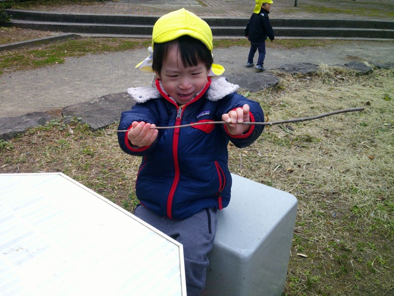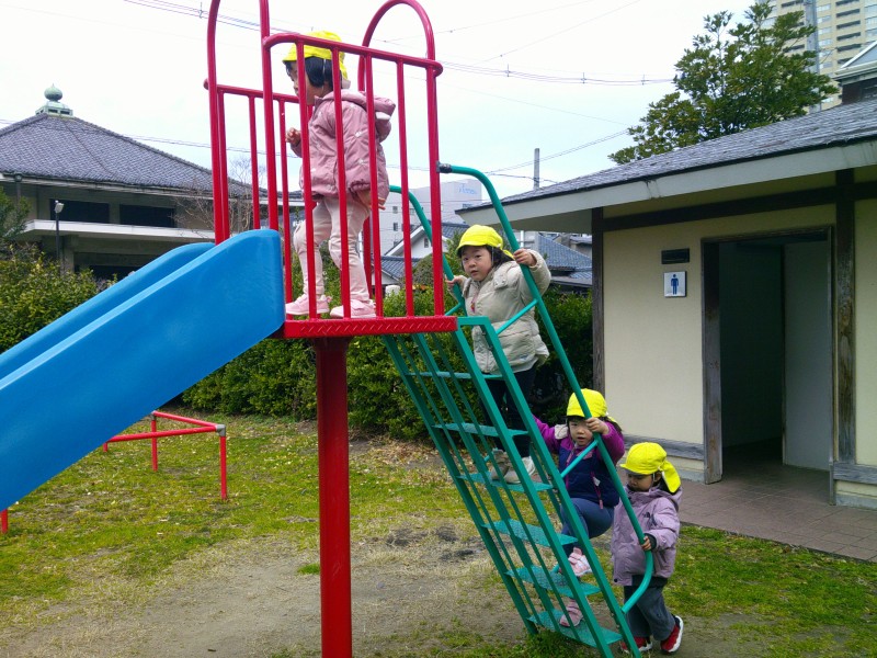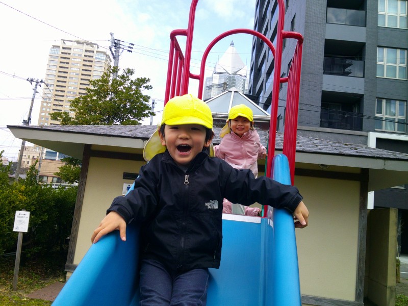 すべり台が大人気で、順番を守りながら上手にあそんでいました。落ちている枝や、石、葉っぱを集めている子もいました。