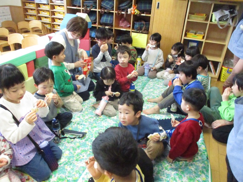 ドキドキワクワクしながら宙組さんのお部屋に行ってみると、なんと‼、“バス”がありました。そのバスにみんなで乗り込み、遠足に出発! 楽しい歌を歌っていると、到着ー! バスから降りてシートに座り、本当の遠足さながらに、特別にみんなでおせんべいを食べました♡ 最後に宙組さんと楽しい思い出ができました!