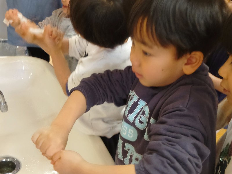 最近では、給食ももりもり自分でスプーンやフォークを使って食べ、食べ終わったあとは、口や手をふきふき。エプロンもしっかりかごの中へ片付けてくれます。