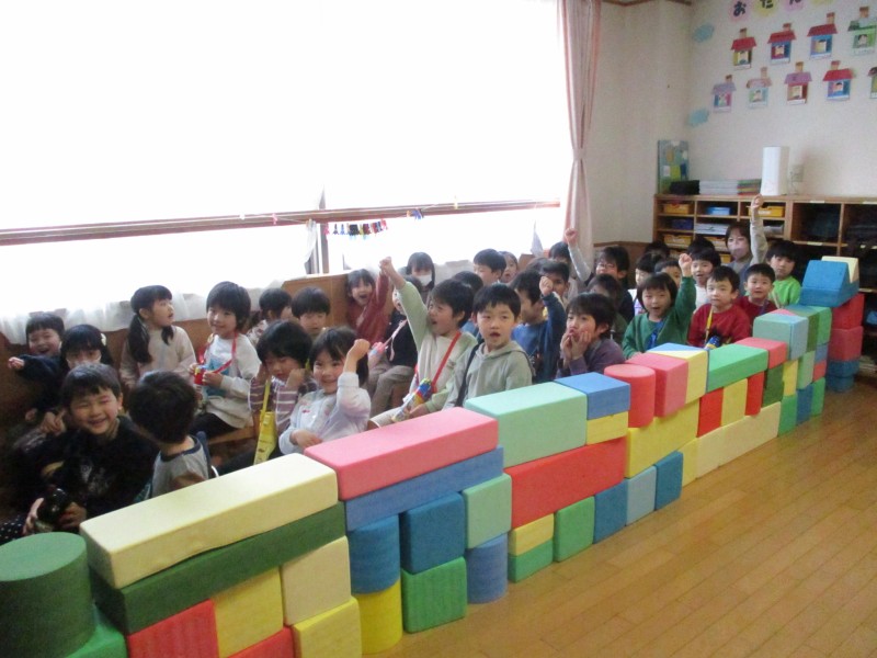 大型ブロックをつなげて、レゴブロックの車を走らせる道や、駐車場を作っていた雪組さん。消防車や救急車、トラックが、今日も元気に出動していました。中には、赤ちゃんとお散歩中のお母さんたちも遊びにきたり・・・。子どもたちの中でルールを設定し、上手にあそぶ姿が多く見られます!