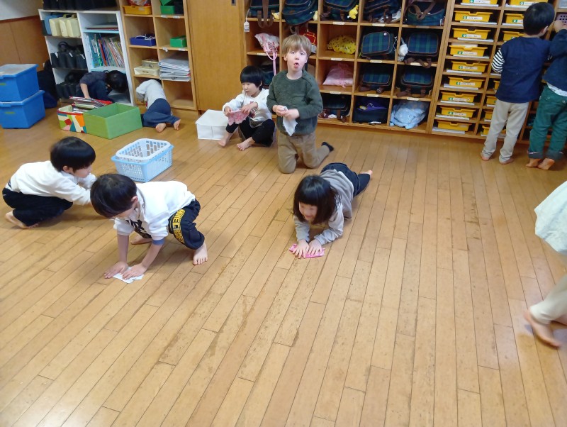 1年使ったお部屋の中を、一人一人雑巾を持って、みんなでピカピカにしました。隅から隅まで雑巾で拭いて、力を合わせてお掃除を頑張りました。